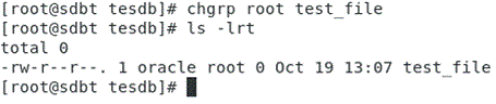 [root@sdbt ~]# ls -lrt|grep test_file -rw-r--r--. 1 root root 0 Oct 25 12:18 test_file [root@sdbt ~]# chgrp oinstall test_file [root@sdbt ~]# ls -lrt|grep test_file -rw-r--r--. 1 root oinstall 0 Oct 25 12:18 test_file [root@sdbt ~]#