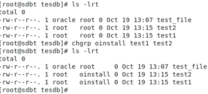 [root@sdbt tesdb]# ls -lrt total 0 -rw-r--r--. 1 oracle oinstall 0 Oct 21 11:04 test1 -rw-r--r--. 1 oracle oinstall 0 Oct 25 12:37 test2 [root@sdbt tesdb]# chgrp root test1 test2 [root@sdbt tesdb]# ls -lrt total 0 -rw-r--r--. 1 oracle root 0 Oct 21 11:04 test1 -rw-r--r--. 1 oracle root 0 Oct 25 12:37 test2 [root@sdbt tesdb]#