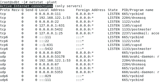 [root@sdbt tesdb]# netstat -plunt Active Internet connections (only servers) Proto Recv-Q Send-Q Local Address Foreign Address State PID/Program name tcp 0 0 192.168.122.1:53 0.0.0.0:* LISTEN 1722/dnsmasq tcp 0 0 0.0.0.0:22 0.0.0.0:* LISTEN 1132/sshd tcp 0 0 127.0.0.1:631 0.0.0.0:* LISTEN 1114/cupsd tcp 0 0 0.0.0.0:5432 0.0.0.0:* LISTEN 1146/postmaster tcp 0 0 127.0.0.1:25 0.0.0.0:* LISTEN 1838/sendmail: acce tcp 0 0 0.0.0.0:111 0.0.0.0:* LISTEN 667/rpcbind tcp6 0 0 :::22 :::* LISTEN 1132/sshd tcp6 0 0 ::1:631 :::* LISTEN 1114/cupsd tcp6 0 0 :::5432 :::* LISTEN 1146/postmaster tcp6 0 0 :::111 :::* LISTEN 667/rpcbind udp 0 0 192.168.122.1:53 0.0.0.0:* 1722/dnsmasq udp 0 0 0.0.0.0:67 0.0.0.0:* 1722/dnsmasq udp 0 0 0.0.0.0:111 0.0.0.0:* 667/rpcbind udp 0 0 0.0.0.0:5353 0.0.0.0:* 732/avahi-daemon: r udp 0 0 0.0.0.0:840 0.0.0.0:* 667/rpcbind udp 0 0 0.0.0.0:26548 0.0.0.0:* 732/avahi-daemon: r udp6 0 0 :::111 :::* 667/rpcbind udp6 0 0 :::840 :::* 667/rpcbind [root@sdbt tesdb]#