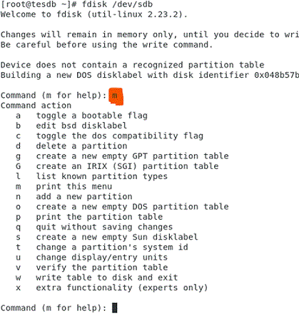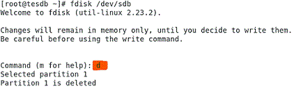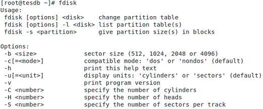 Command Purpose fdisk -m Print the available (FDISK) commands fdisk -p Print the partition table 0 ====================================================== fdisk -d Delete a partition ======================================================= fdisk -l to view details of available disk partitions. ======================================================= Create a Hard Disk Partition: For this go inside the hard drive partition that is the /dev/sdb partition, and use the following command: fdisk /dev/sdb fdisk -w Write the table to the hard drive Now you have to type n to create new partition and then type p for making a primary