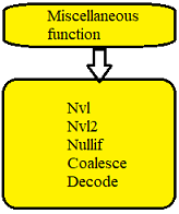 SQL - FUNCTIONSA function is a subprogram that is used to return a single value. ![]() Scalar functions: The Types Of Functions: These functions operate on single rows only and produce one result per row. Types: ![]() a. Character function: It used to accept character inputs and return either character or number values as output. ![]() Case Manipulative Function: lower : SQL> select lower('TESDB') from dual; LOWER ----- tesdbUpper : SQL> select lower('tesdb') from dual; UPPER ---- TESDBInitcap : SQL> select Initcap('tesdb') from dual; Initcap ---- TesdbCharacter Manipulative Function: concat: SQL> select 'Welcome'||' to '||'Tesdb' message 2 from dual; welcome to TesdbLpad : SQL> select lpad(ename,'10','*')from emp; LPAD(ENAME,'10','*') ---------------------------------------- *****SMITH *****ALLEN ******WARD *****JONES ****MARTIN *****BLAKE *****CLARK *****SCOTT ******KING ****TURNER *****ADAMS *****JAMES ******FORD ****MILLER 14 rows selectedRpad : SQL> select rpad(ename,'10','*') from emp; RPAD(ENAME,'10','*') ---------------------------------- SMITH***** ALLEN***** WARD****** JONES***** MARTIN**** BLAKE***** CLARK***** SCOTT***** KING****** TURNER**** ADAMS***** JAMES***** FORD****** MILLER**** 14 rows selected.Substring : SQL> select substr(ENAME,2,4) from emp; SUBSTR(ENAME,2,4) ---------------- MITH LLEN ARD ONES ARTI LAKE LARK COTTLENGTH : SQL> select job,length(job) from emp; JOB LENGTH(JOB) --------- ----------- CLERK 5 SALESMAN 8 SALESMAN 8 MANAGER 7 SALESMAN 8 MANAGER 7 MANAGER 7 ANALYST 7 PRESIDENT 9 SALESMAN 8 CLERK 5REPLACE : SQL> select replace('Test','t','db') from dual; REPLA ----- TesdbTranslate : SQL> select translate('Teste','te','db') from dual; TRANS ----- TbsdbTrim : SQL> select trim('g' from 'gogoldg') from dual; TRIM ----- ogoldb. Numeric function: ![]() SQL> select abs(-125.2578) from dual; ABS(-125.2578) -------------- 125.2578Ceil : SQL> select ceil(33.3) from dual; CEIL(33.3) ---------- 34Floor : SQL> select floor(32.3) from dual; FLOOR(32.3) ----------- 32Round : SQL> select round(32.67) from dual; ROUND(32.67) ------------ 33Power : SQL> select power(10,3) from dual; POWER(10,3) ----------- 1000Sqrt : SQL> select sqrt(81) from dual; SQRT(81) ---------- 9Mod : SQL> select mod(25,5) from dual; MOD(25,5) ---------- 0c. Date Function: It used to accept date input and return date values as output. ![]() SQL> select sysdate from dual; SYSDATE --------- 30-SEP-23 SQL> select systimestamp from dual; SYSTIMESTAMP ---------------------------------------- 30-SEP-23 10.30.33.277915 AM +05:30Months_between: SQL> select months_between(sysdate,'20-june-2023') from dual; MONTHS_BETWEEN(SYSDATE,'20-JUNE-2023') -------------------------------------- 3.33676187 SQL> select hiredate,months_between(sysdate,hiredate) from emp; HIREDATE MONTHS_BETWEEN(SYSDATE,HIREDATE) --------- -------------------------------- 17-DEC-80 513.43361 20-FEB-81 511.336835 22-FEB-81 511.272319 02-APR-81 509.917481 28-SEP-81 504.078771 01-MAY-81 508.949739 09-JUN-81 507.691674 19-APR-87 437.369093 17-NOV-81 502.43361 08-SEP-81 504.723932 23-MAY-87 436.240061 03-DEC-81 501.885223 03-DEC-81 501.885223 23-JAN-82 500.240061 14 rows selected.Add_months: SQL> select sysdate,add_months(sysdate,3) from dual; SYSDATE ADD_MONTH --------- --------- 30-SEP-23 31-DEC-23Last_day: SQL> select sysdate,last_day(sysdate) from dual; SYSDATE LAST_DAY( --------- --------- 30-SEP-23 30-SEP-23Next_day: SQL> select sysdate,next_day(sysdate,'monday') from dual; SYSDATE NEXT_DAY( --------- --------- 30-SEP-23 02-OCT-23 SQL> select sysdate,trunc(sysdate,'month') from dual; SYSDATE TRUNC(SYS --------- --------- 30-SEP-23 01-SEP-23d. Conversion Function : ![]() To_char : SQL> select sysdate,to_char(sysdate,'month') from dual; SYSDATE TO_CHAR(SYSDATE,'MONTH') --------- -------------------------- 30-SEP-23 septemberTo_date : SQL> select sysdate,to_date('10-12-22','dd-mm-yyyy') from dual; SYSDATE TO_DATE(' --------- --------- SEP-23 10-DEC-22To_number : SQL> select to_number('1000','9999') from dual; TO_NUMBER('1000','9999') ------------------------ 1000 e. Miscellaneous Function : ![]() SQL> select sal,comm,nvl(comm,0) from emp; SAL COMM NVL(COMM,0) ---------- ---------- ----------- 800 0 1600 300 300 1250 500 500 2975 0 1250 1400 1400 2850 0 2450 0 3000 0 5000 0 1500 0 0 1100 0 950 0 3000 0 1300 0Nvl2: SQL> select sal,comm,nvl2(comm,0,10),sal+nvl2(comm,0,10) from emp; SAL COMM NVL2(COMM,0,10) SAL+NVL2(COMM,0,10) ---------- ---------- --------------- ------------------- 800 10 810 1600 300 0 1600 1250 500 0 1250 2975 10 2985 1250 1400 0 1250 2850 10 2860 2450 10 2460 3000 10 3010 5000 10 5010 1500 0 0 1500 1100 10 1110 950 10 960 3000 10 3010 1300 10 1310Nullif: SQL> select ename,job,length(ename) as “length”, floor(nullif((length(ename)+length(job)),10)) as "nullif" from emp; ENAME JOB ???LENGTH??? nullif ---------- --------- ------------ ---------- SMITH CLERK 5 ALLEN SALESMAN 5 13 WARD SALESMAN 4 12 JONES MANAGER 5 12 MARTIN SALESMAN 6 14 BLAKE MANAGER 5 12 CLARK MANAGER 5 12 SCOTT ANALYST 5 12 KING PRESIDENT 4 13 TURNER SALESMAN 6 14 ADAMS CLERK 5 JAMES CLERK 5 FORD ANALYST 4 11 MILLER CLERK 6 11Coalesce: SQL> select coalesce(null,'B','C','D','E','F') from dual; C --- BDecode: SQL> select job,decode(job,'CLERK','CK','SALESMAN','SM','MANAGER', 'MG','ANALYST','AT','PRESIDENT','PT') from emp; JOB DE --------- -- CLERK CK SALESMAN SM SALESMAN SM MANAGER MG SALESMAN SM MANAGER MG MANAGER MG ANALYST AT PRESIDENT PT SALESMAN SM CLERK CK CLERK CK ANALYST AT CLERK CKAggregate Function : ![]() Count: SQL> select count(comm) from emp; COUNT(COMM) ----------- 4Sum: SQL> select sum(sal) from emp; SUM(SAL) ---------- 29025Average: SQL> select avg(sal) from emp; AVG(SAL) ---------- 2073.21429Min: SQL> select min(sal) from emp; MIN(SAL) ---------- 800Max: SQL> select max(sal) from emp MAX(SAL) ---------- 5000Order by: SQL> select ename,job,sal from emp order by sal desc; ENAME JOB SAL ---------- --------- ---------- KING PRESIDENT 5000 FORD 